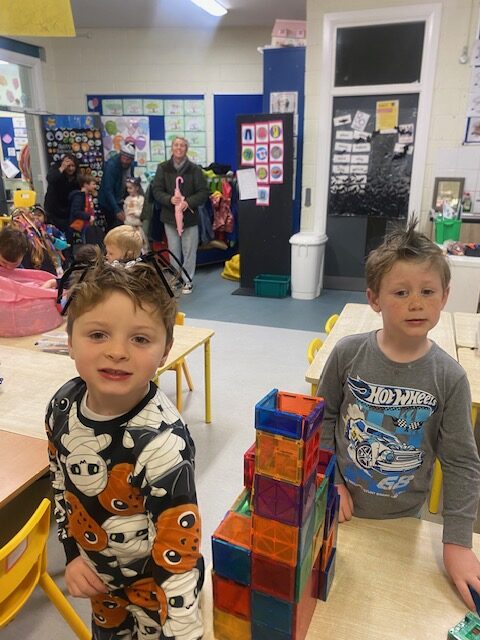 It was another busy month in the junior and senior infant classroom. We started Aistear which everyone was delighted about. Our theme was school and the library. We visited the library in Rathdrum which was a lovely morning of reading & fun. We really enjoyed our mask workshop that was funded by the Wicklow County Council and loved the day up in the RDA hall where we had a parade with the rest of the school. We constructed witches as our Halloween art and enjoyed playing all the traditional Halloween games. We had a super dress up day followed by a Halloween scavenger hunt in the memorial park.